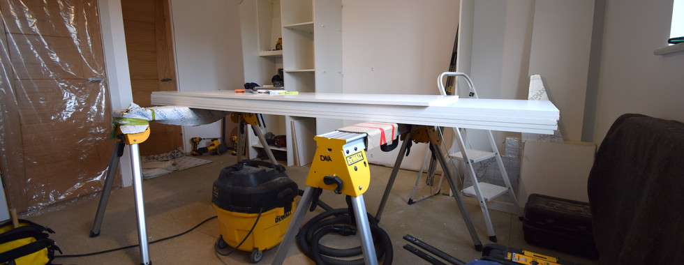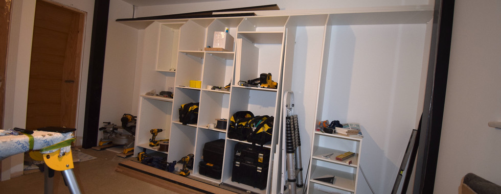 The wardrobes were to be built over the full width of the room (4.28m or 14 feet) and so that no visible joins were left in the floor and ceiling scribes we decided to build a post, off centre, allowing the door combinations to be most efficient with the openings. This also meant that both ends could be accessed at the same time without the doors colliding.